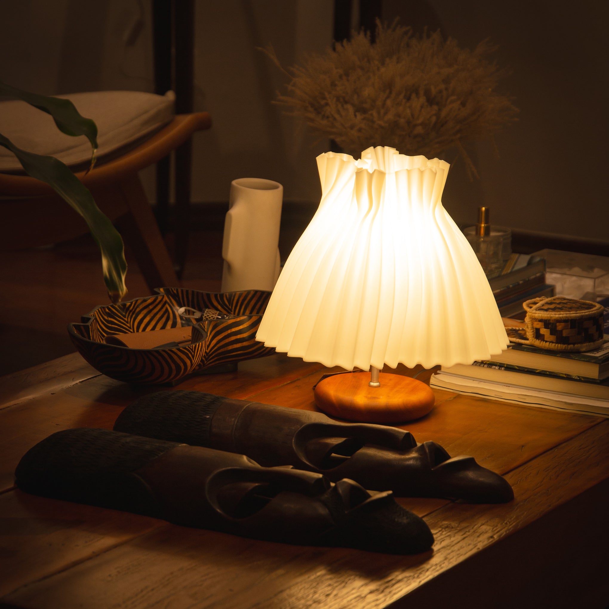 A cúpula é impressa em 3D com bioplástico de milho e, em seguida, aquecida e modelada manualmente, adquirindo contornos orgânicos que evocam o movimento leve de uma dança. Em contraste, a base torneada em peroba rosa de demolição traz solidez, equilibrando a delicadeza da forma.