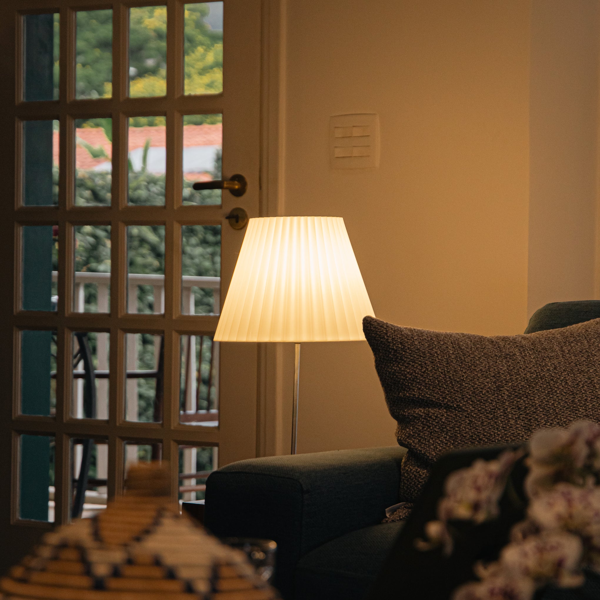 Produzida com tecnologia sustentável, a cúpula é impressa em 3D com bioplástico derivado do milho e da cana-de-açúcar. Disponível na cor off white e também em versões multicoloridas, a Luminária Sanfonada combina rigor geométrico e delicadeza orgânica em uma peça icônica e versátil.