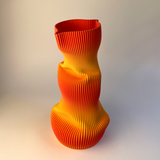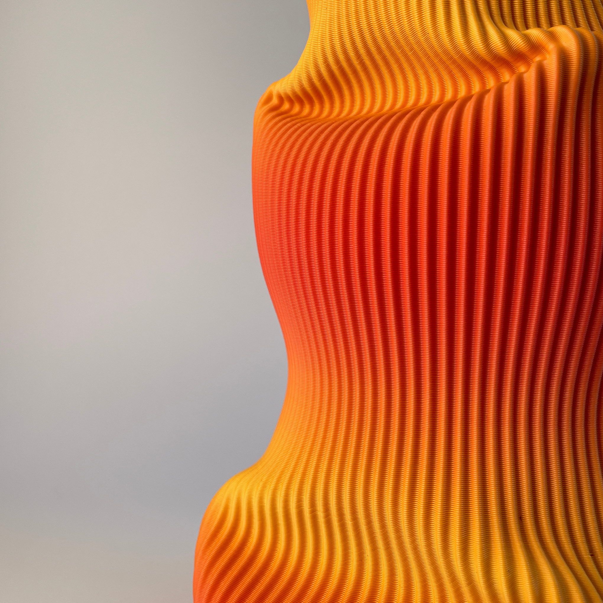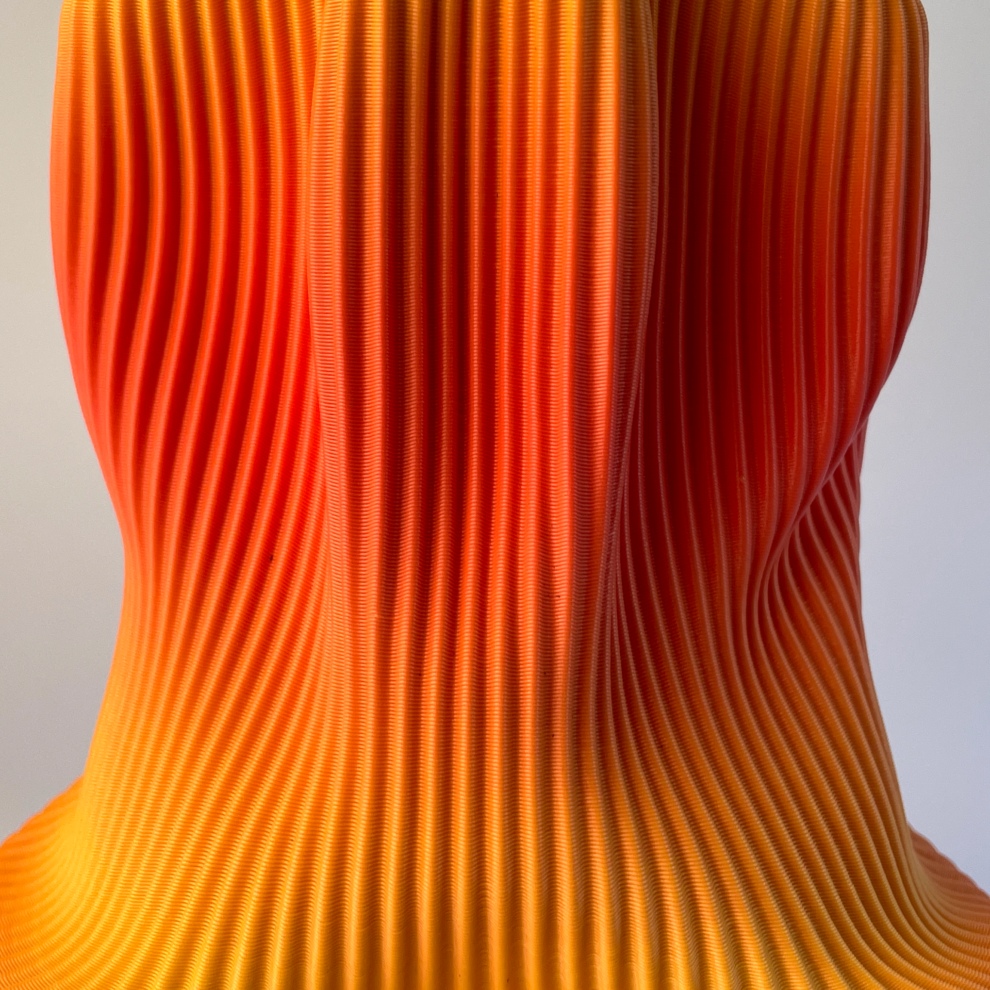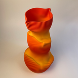 As curvas do vaso são formadas pelo toque dos dedos do artista sobre a superfície do bioplástico impresso em 3D. O material quando aquecido revela impressionante plasticidade, permitindo a modelagem de curvas que remetem a formas orgânicas em movimento.
