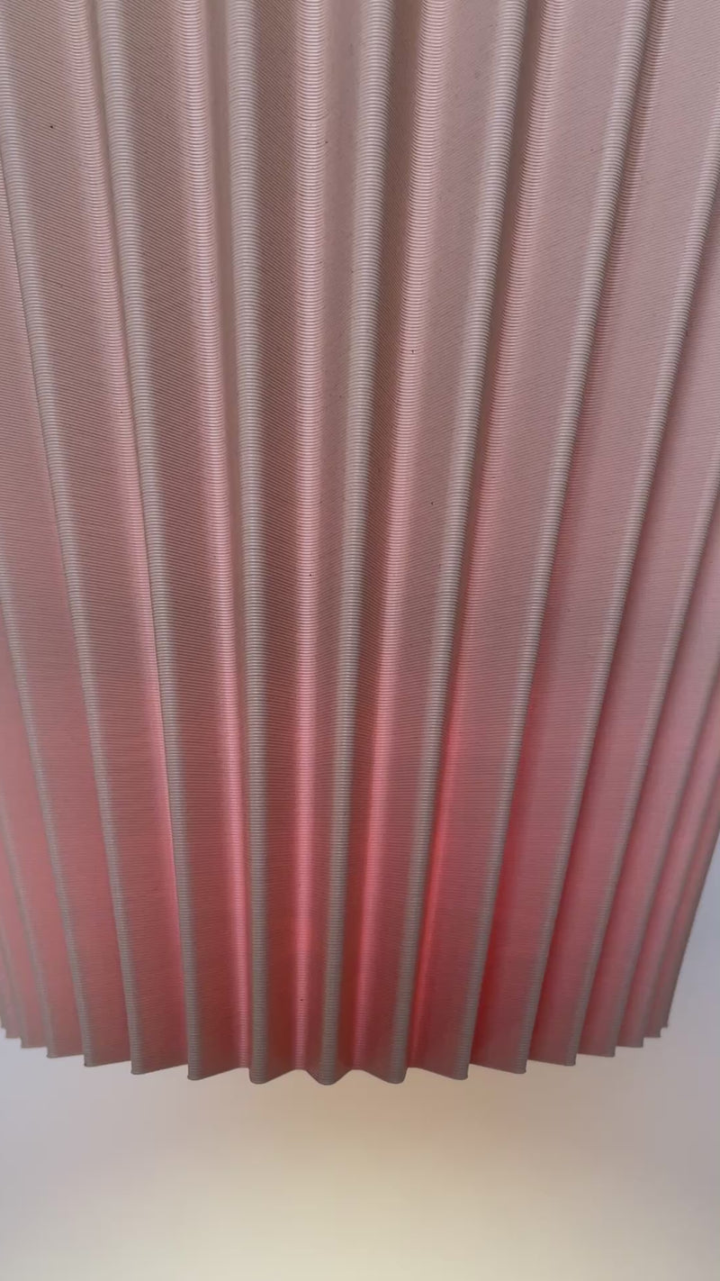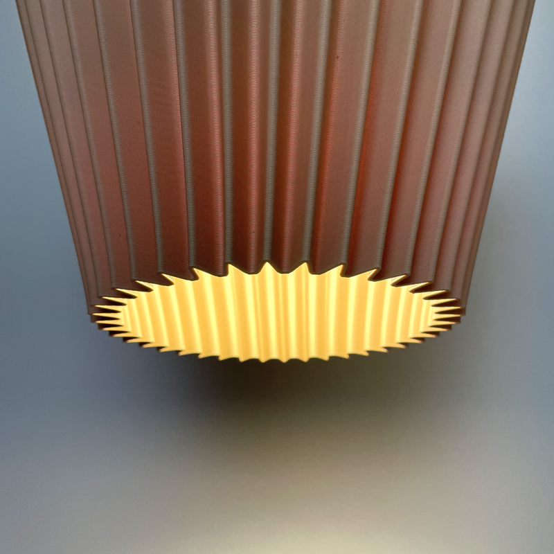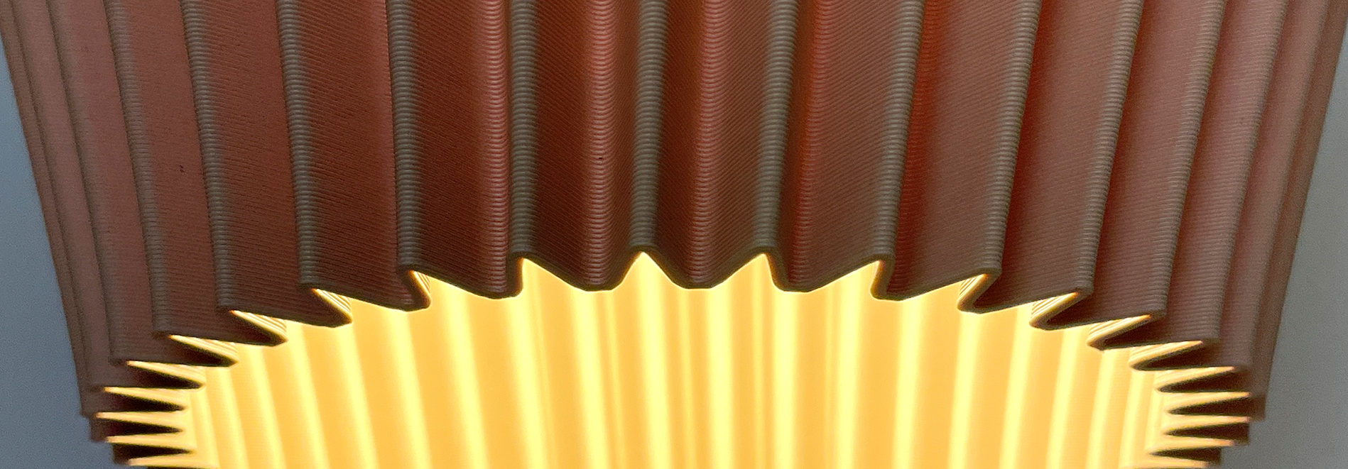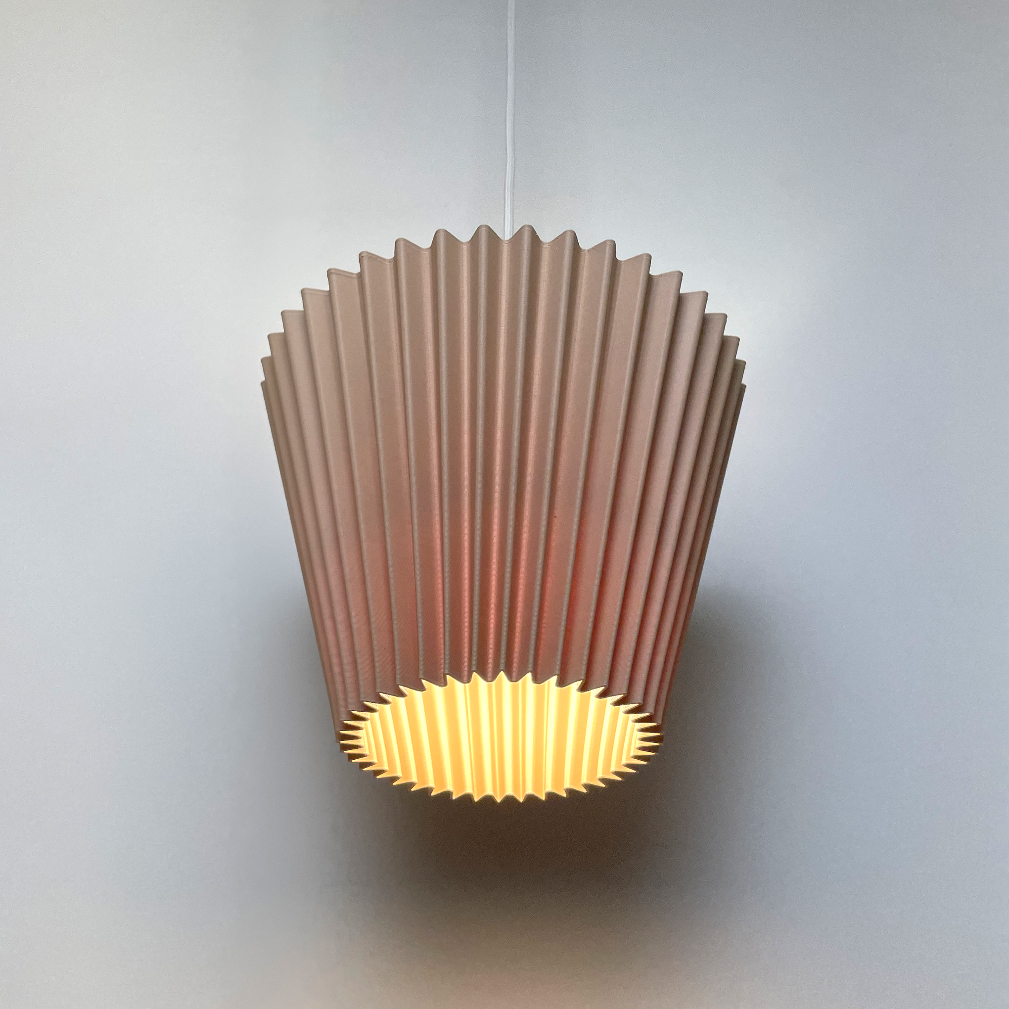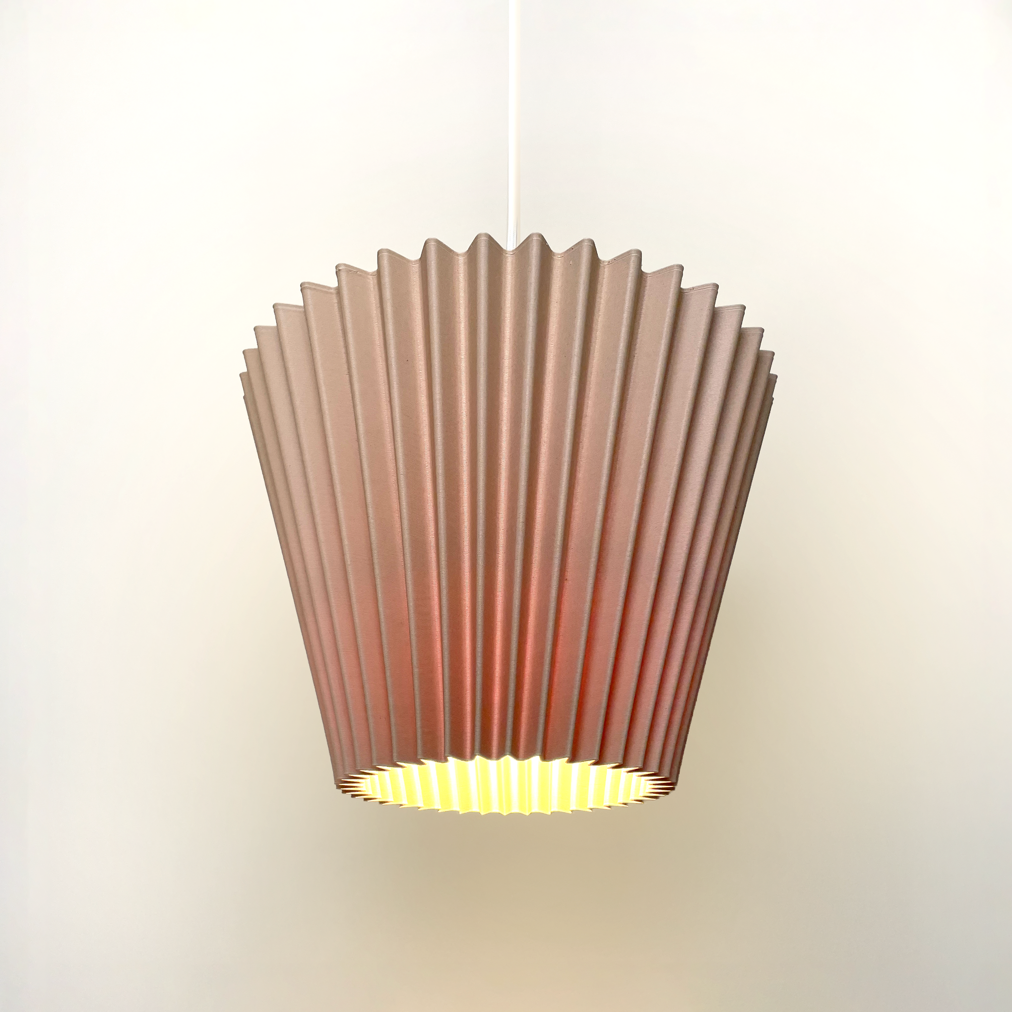 A luminária Sanfonada pENDENTE possui a cúpula impressa em 3D com o bioplástico PLA (Ácido Poliláctico). Este material é produzido a partir do amido do milho e da cana-de-açúcar, e possui ótimas características de resistência física e acabamento.