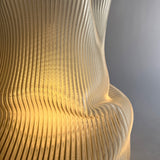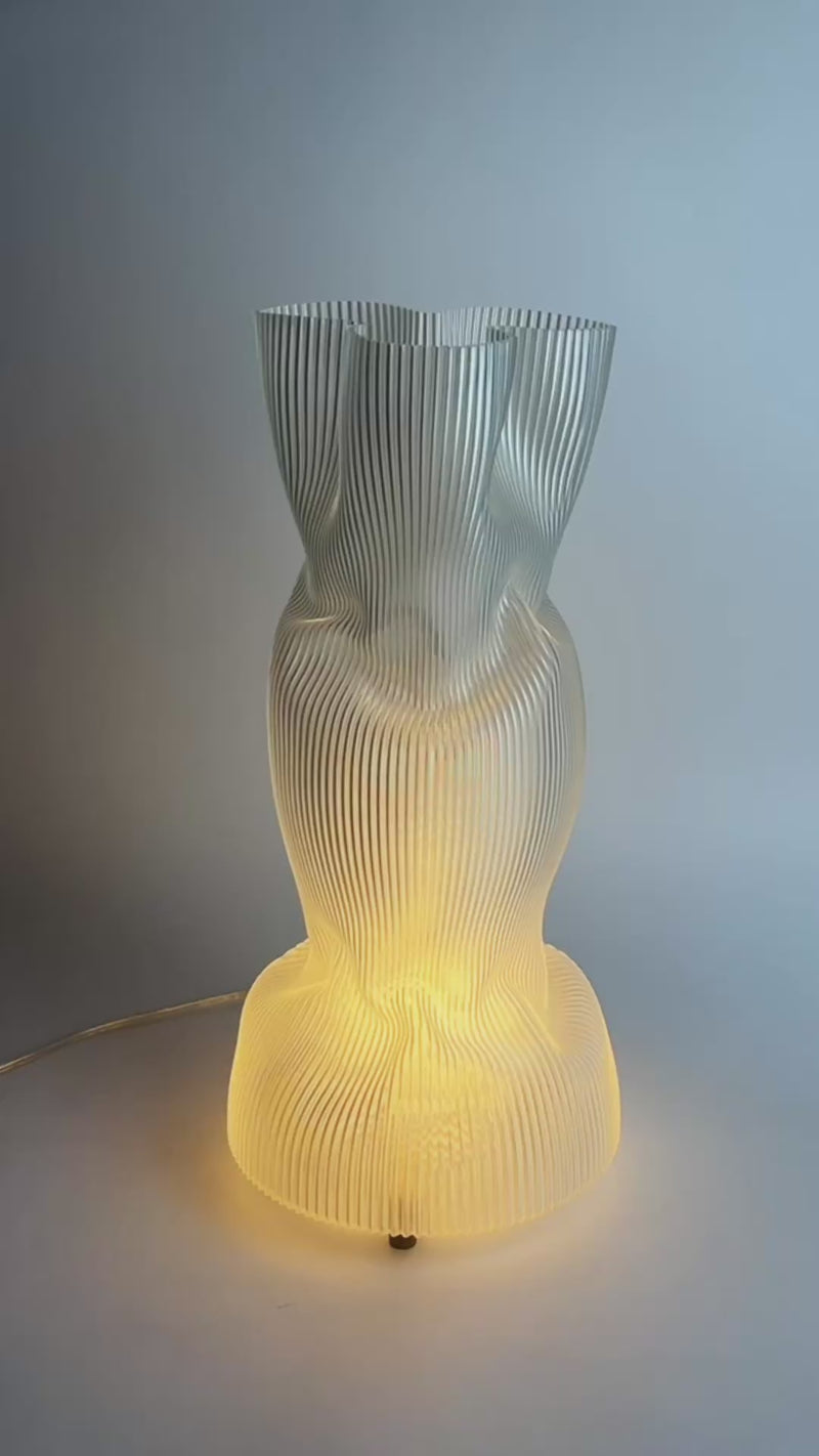 Tais curvas enigmáticas, que se assemelham a um tecido, proporcionam variação deliciosa entre luz e sombra na volumetria da peça. O resultado é uma luminária com luz difusa e confortável, que provém aconchego para salas, quartos, e ambientes em geral.