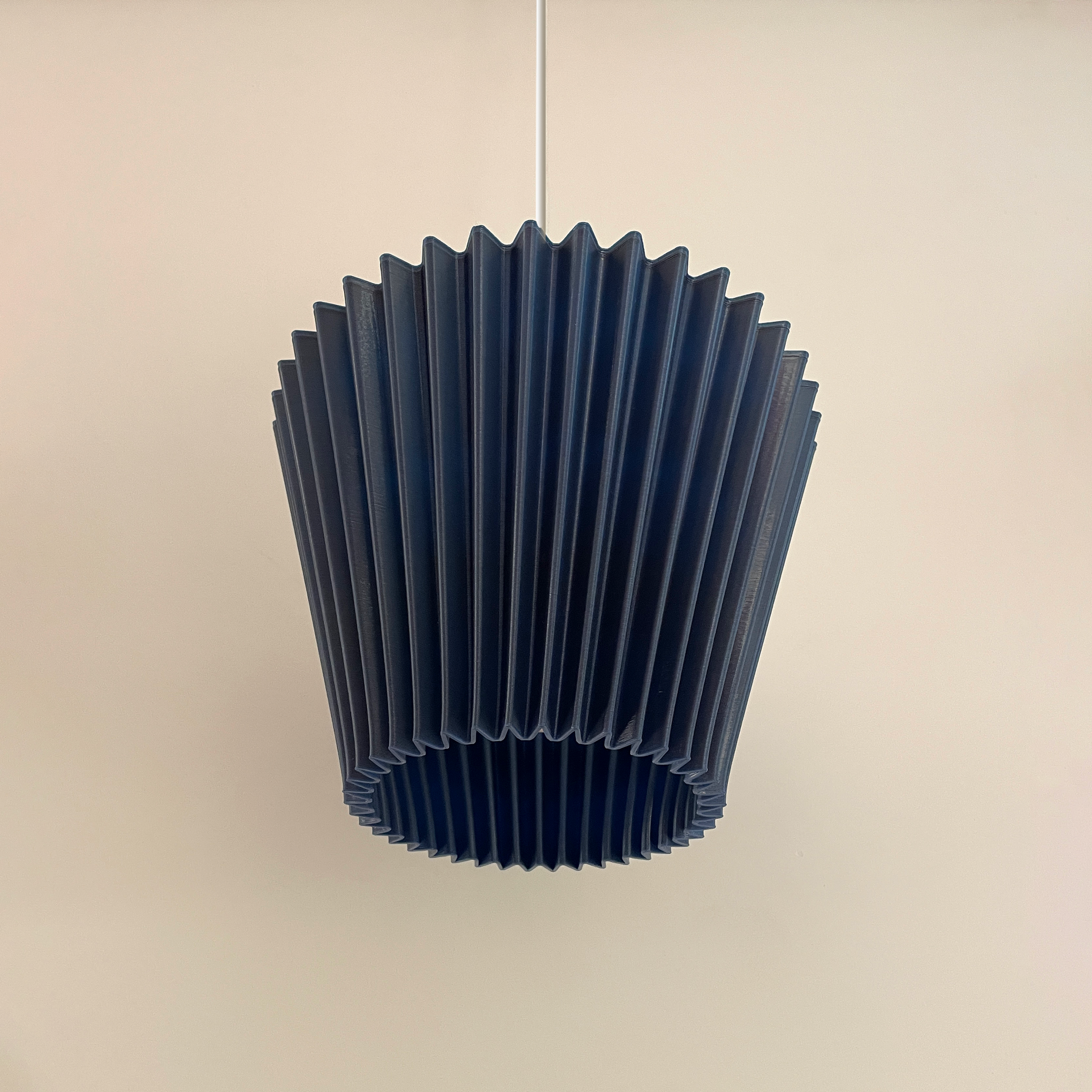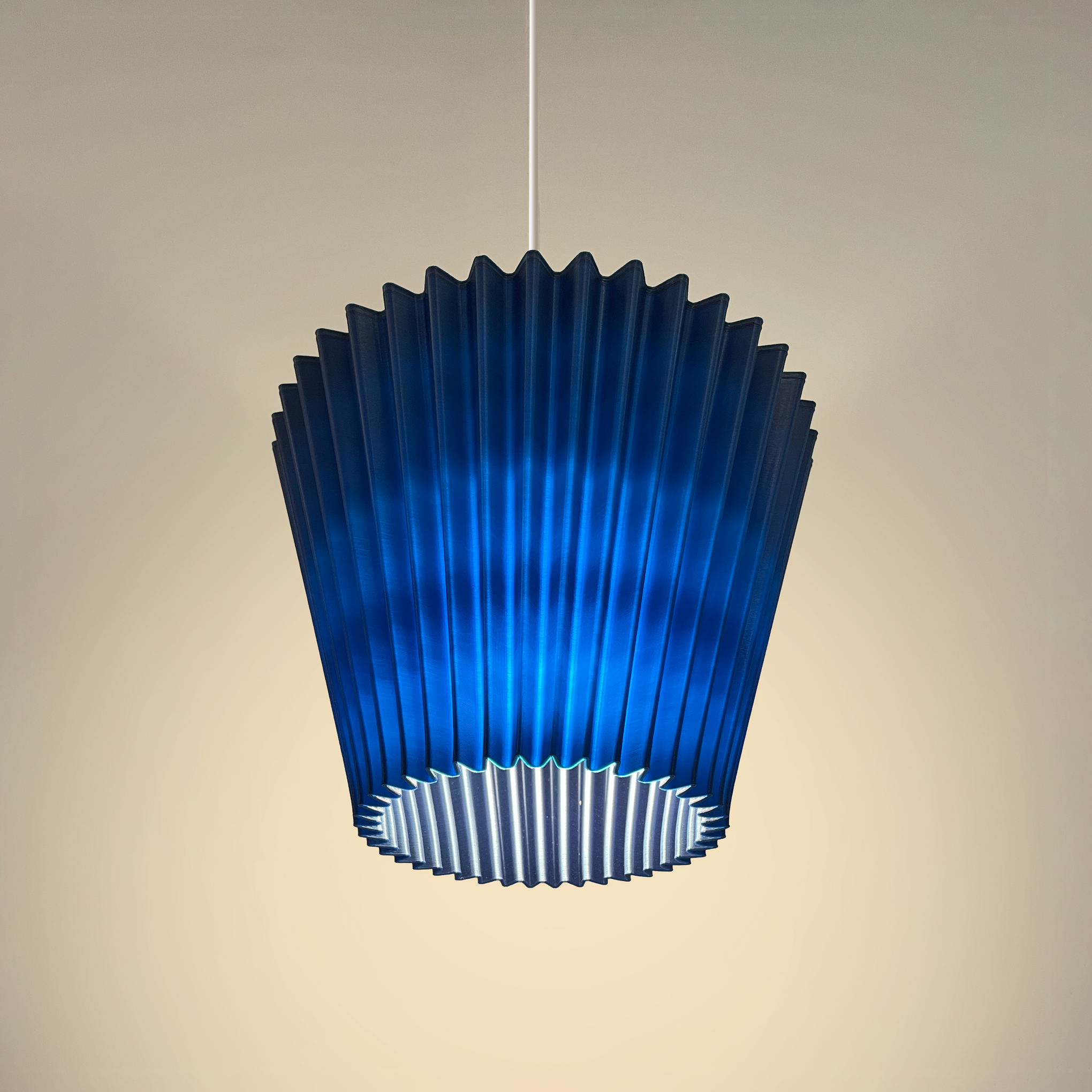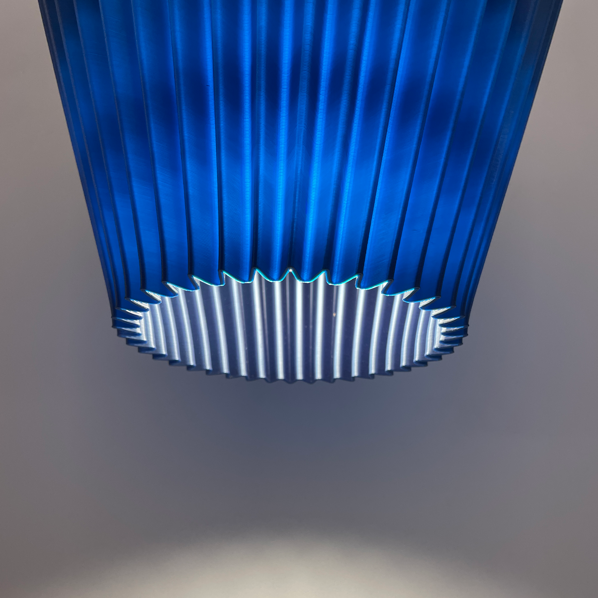 A luminária Sanfonada Pendente possui a cúpula impressa em 3D com o bioplástico PLA (Ácido Poliláctico). Este material é produzido a partir do amido do milho e da cana-de-açúcar, e possui ótimas características de resistência física e acabamento.