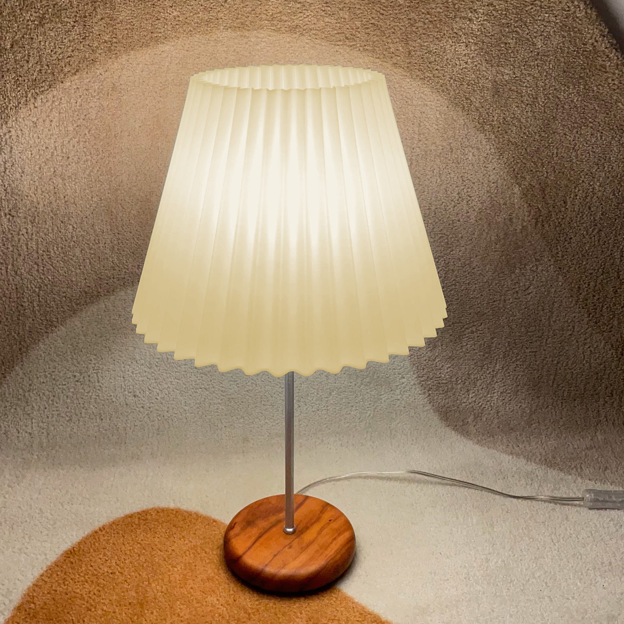 A luminária Sanfonada possui base em peroba rosa de demolição e cúpula impressa em 3D com o bioplástico PLA (Ácido Poliláctico). Este material é produzido a partir do amido do milho e da cana-de-açúcar, e possui ótimas características de resistência física e acabamento.