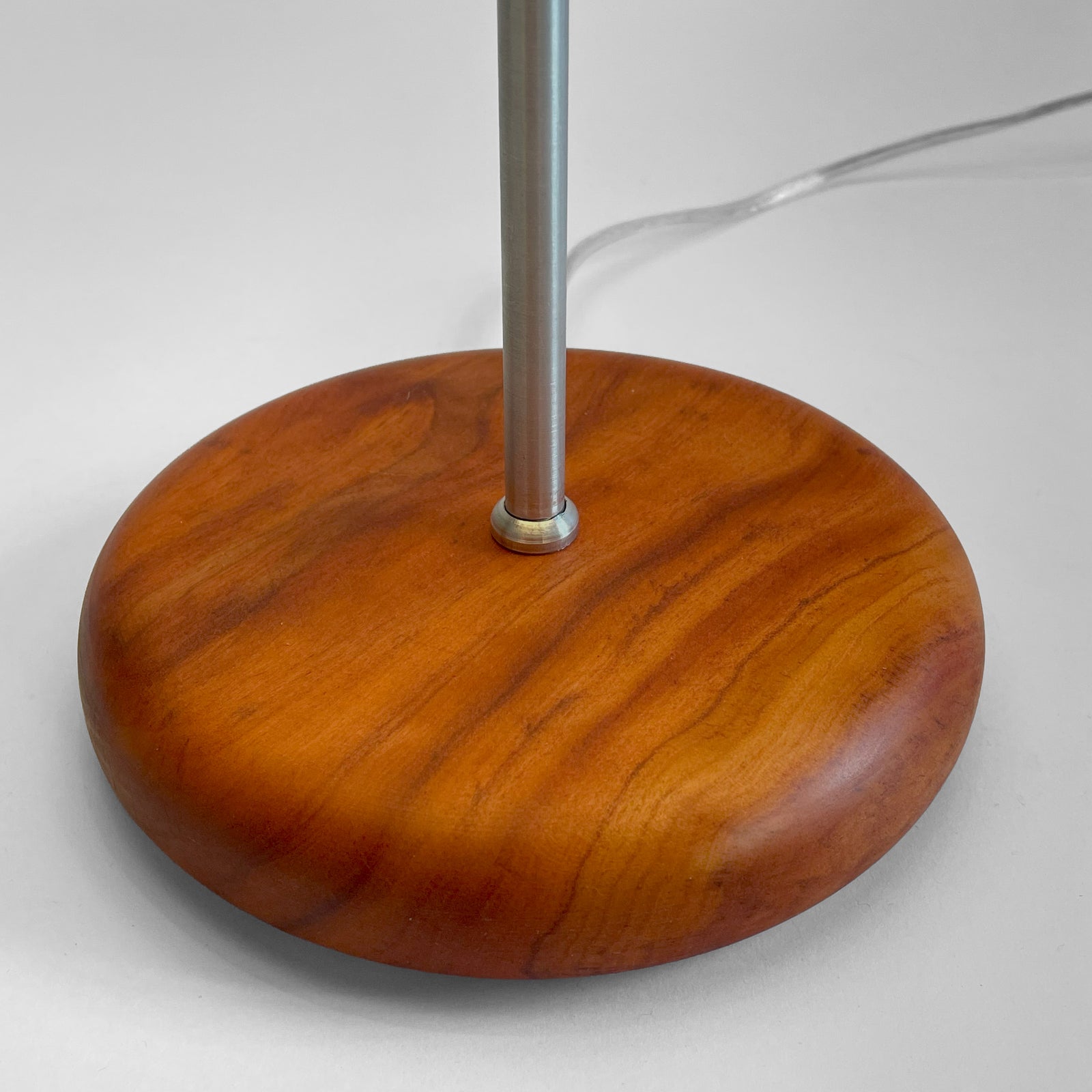 A peça reúne formas simples em uma composição de contrastes: a cúpula, com linhas retas e sanfonadas, dialoga com a base arredondada em peroba rosa de demolição, resultando em um conjunto de equilíbrio singelo.
