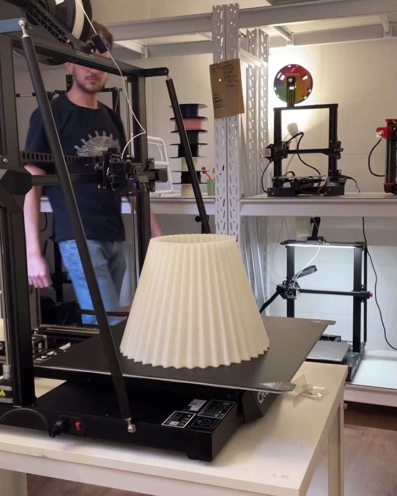 Produzida com tecnologia sustentável, a cúpula é impressa em 3D com bioplástico derivado do milho e da cana-de-açúcar. Disponível na cor off white e também em versões multicoloridas, a Luminária Sanfonada combina rigor geométrico e delicadeza orgânica em uma peça icônica e versátil.