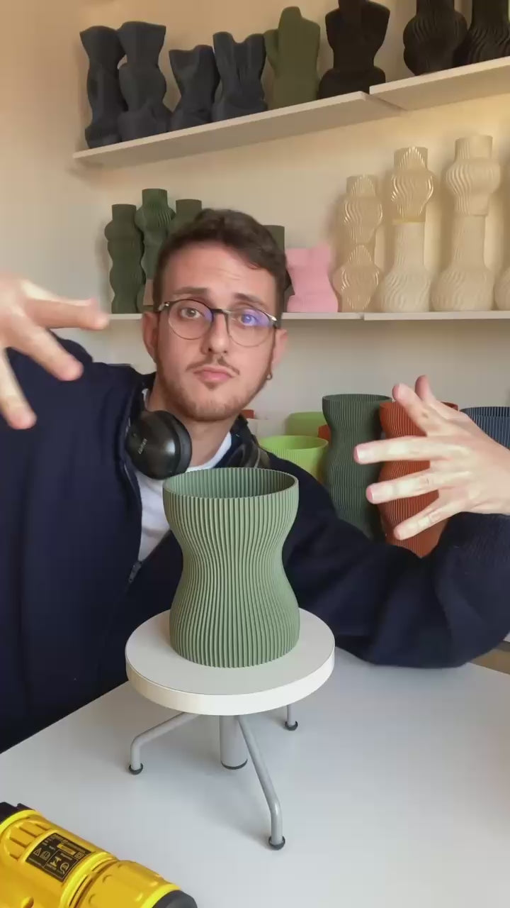 Vaso utilitário impresso em 3D com bioplástico e modelado à mão. Desenho expressivo e textura delicada. Cada vaso é único, modelado pelas mãos de artistas.